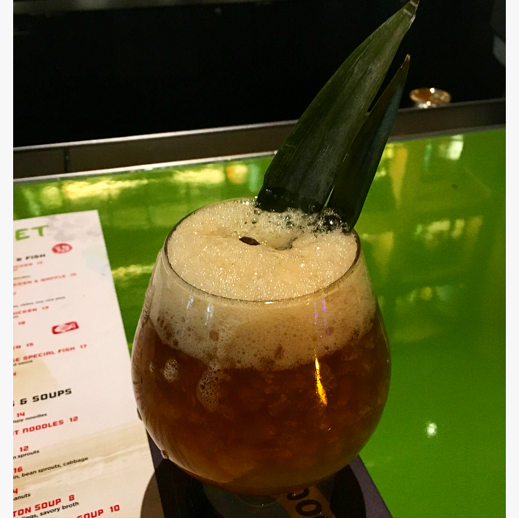 The decor is tiki inspired with a fun little bus in the bar area with two booth sections that I didn’t realize was first come first serve or I definitely would have snagged that. How fun!