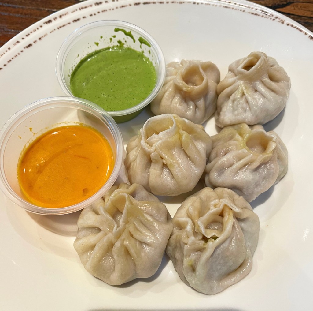 Bison Momos: Humanely harvested bison from South Dakota, onions, ginger, spices wrapped in organic all-purpose flour wrapper. Served with tomato chutney and spicy mint cilantro chutney