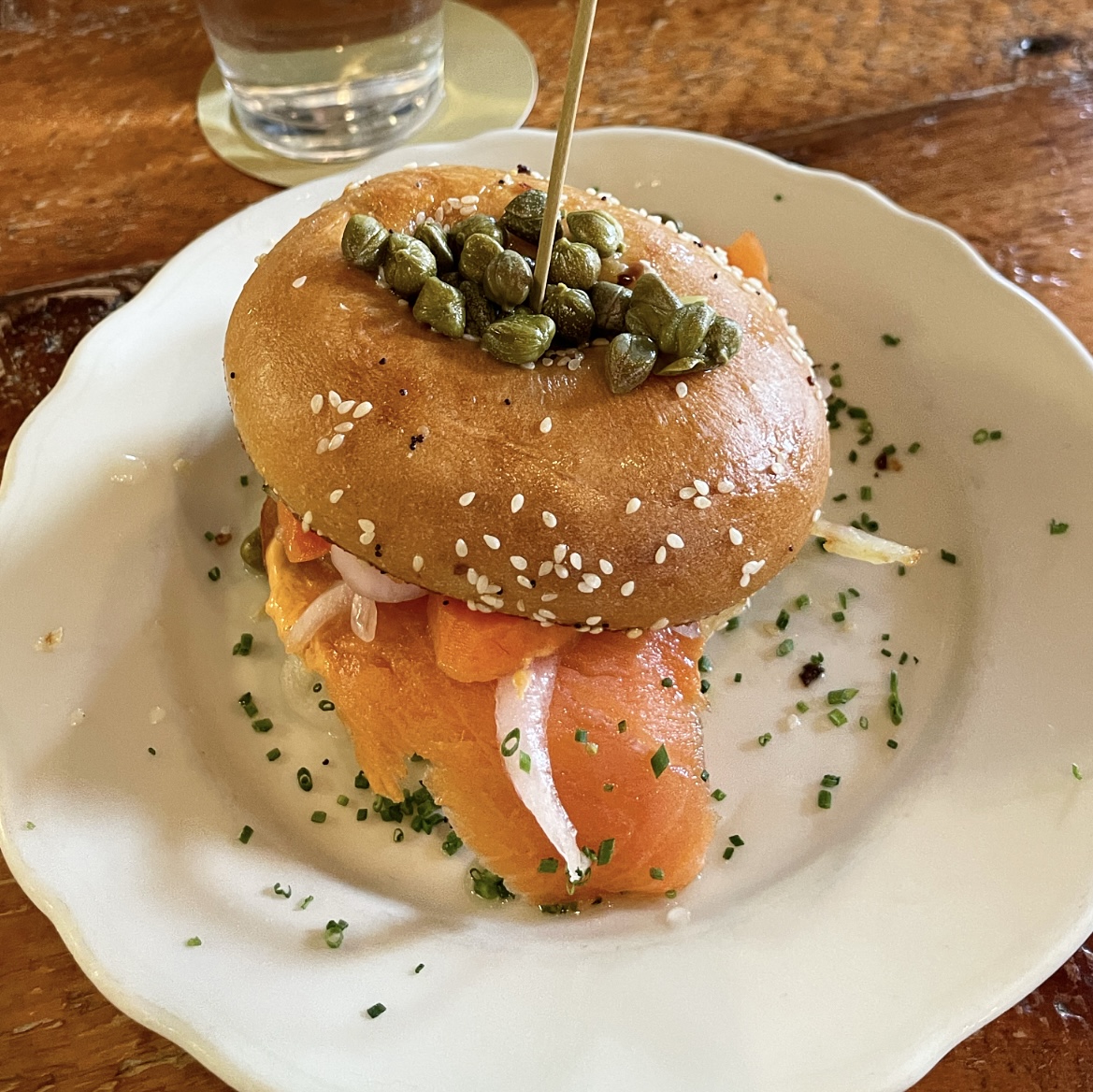 Bourbon Smoked Salmon Toast: Raw smoked alaskan salmon, toasted everything bagel, pimento cream cheese, capers, pickled veggies