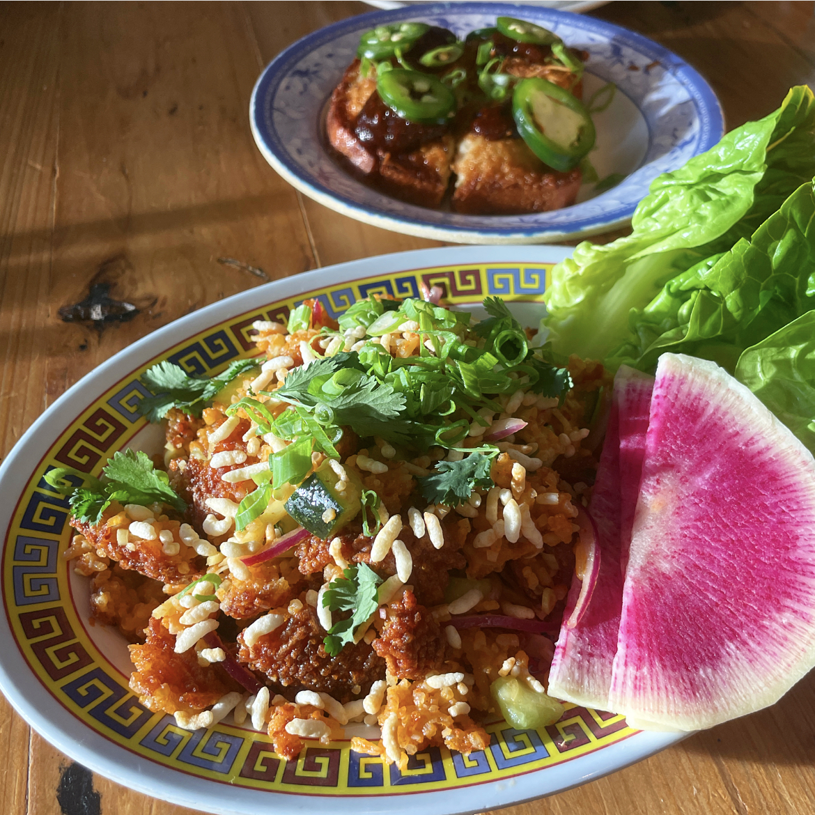 Crispy Rice Salad: Red curry rice, cucumber, ginger, fish sauce, lime, herbs, scallion, puffed rice, baby gem lettuce scoops