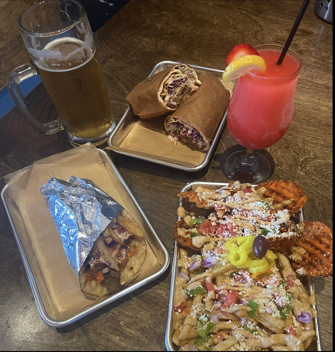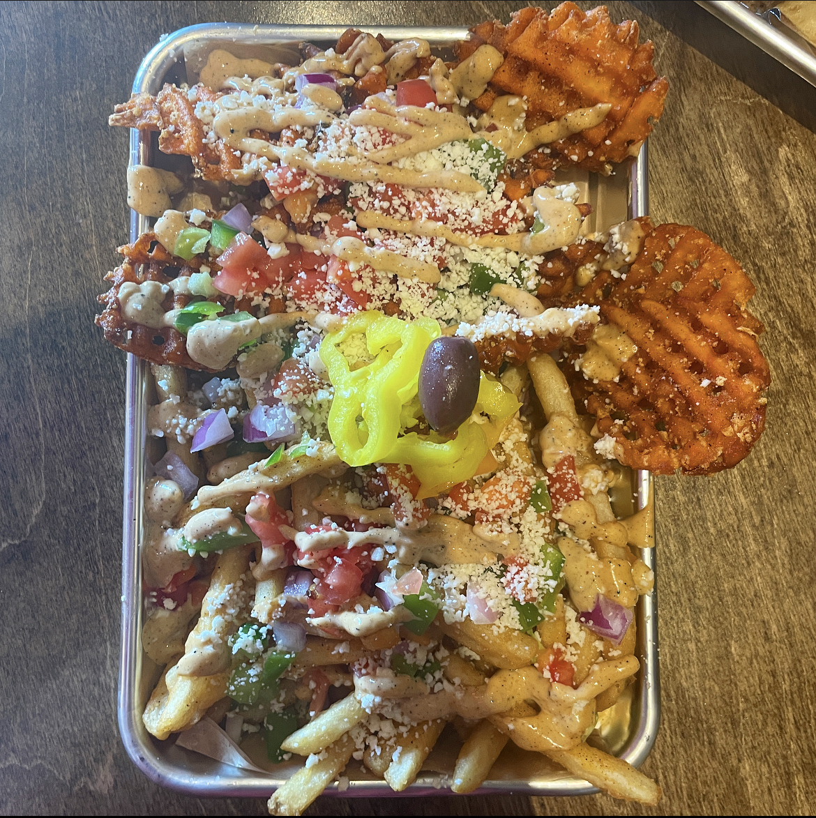 Mixed Street Cart Fries: Mix of sweet potato waffle and regular cut fries topped with garlic aioli, feta, onion, green pepper, tomato, olives, and pepperoncinis