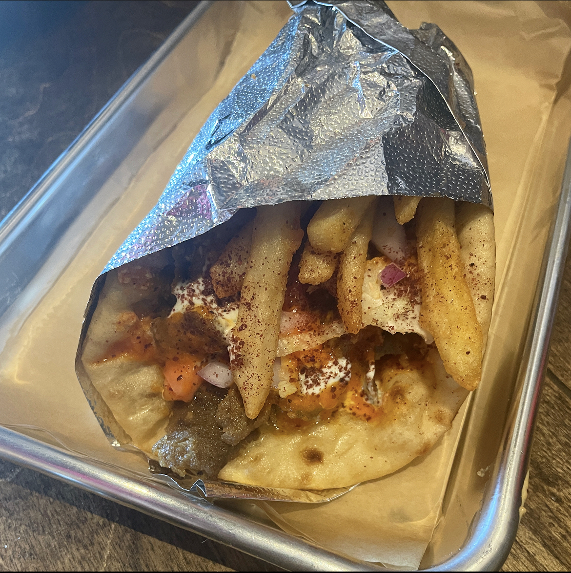 The Gyro: Zesty feta spread, Berliner Sauce, tzatziki, onion, tomato and fries inside with beef and lamb