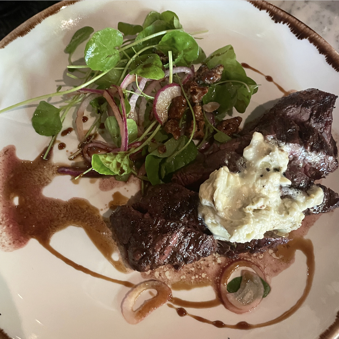8oz Grilled Hanger Steak: Smoked Bleu Cheese Butter, Candied Walnuts, Aged Balsamic, and Watercress