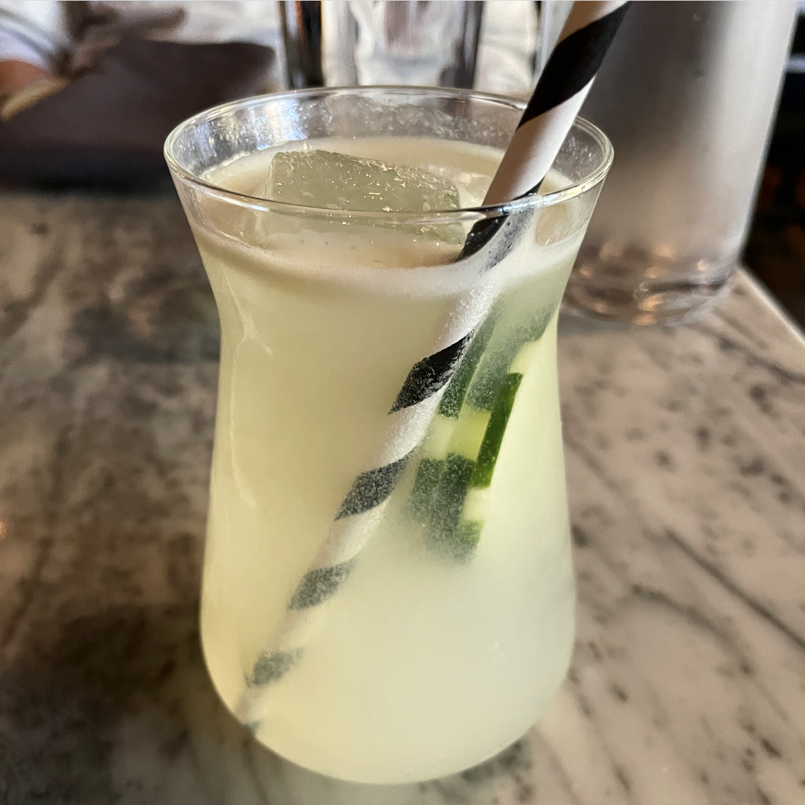 English Cucumber: Fords Gin, St. Elder Elderflower, Lemon, Cucumber Water, Honey Simple Syrup, and Cucumber Slices