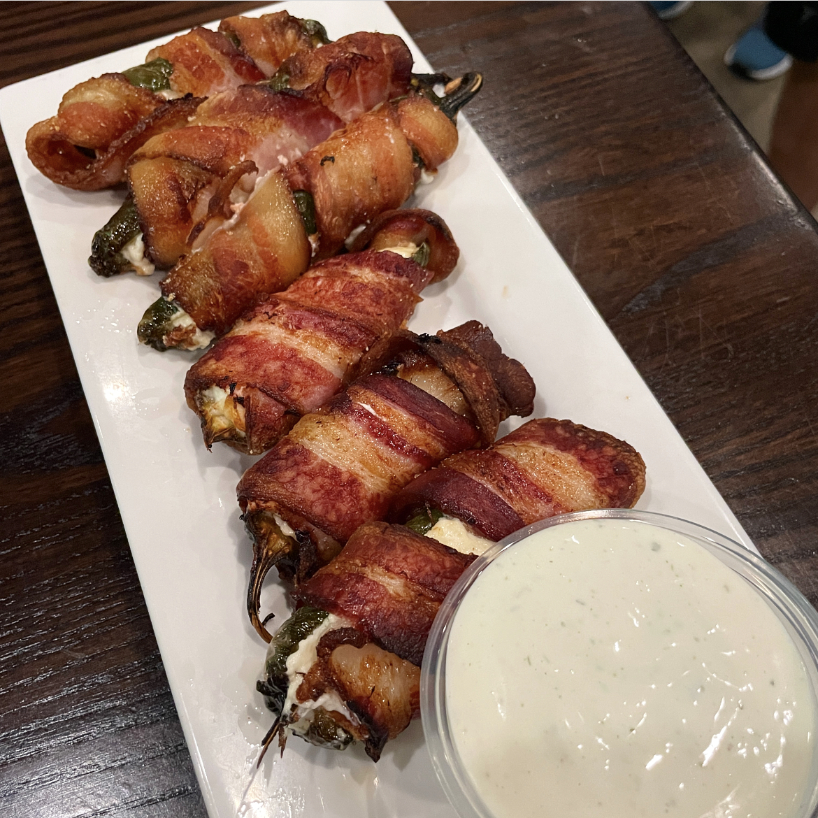 Jalapeno Poppers: Six jalapenos stuffed with cream cheese, bacon wrapped and fried. Served with ranch dressing