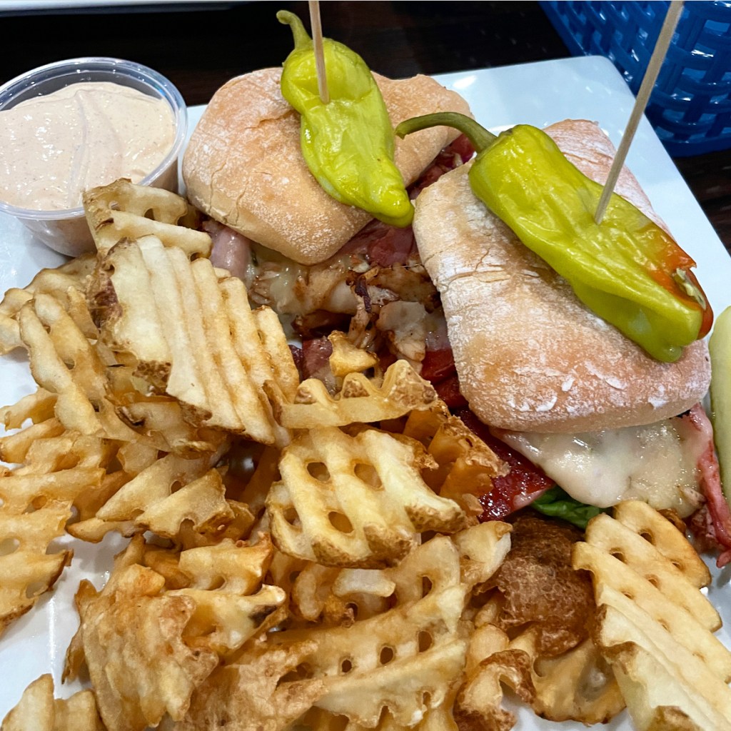 The Sicilian: Roasted turkey, ham, pepperoni and pepper jack cheese on a toasted ciabatta roll, with lettuce, tomato, onion, Italian dressing and mayo