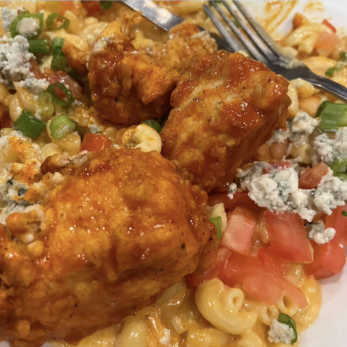Buffalo Mac and Cheese: Macaroni noodles in a buffalo cheese sauce, topped with blue cheese crumbles, tomatoes and green onion with Chicken