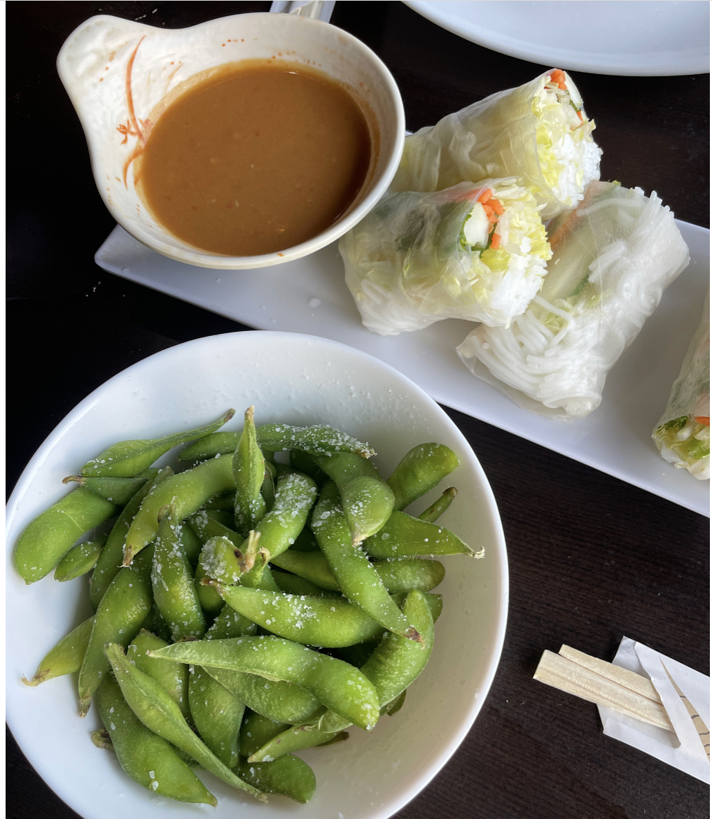 Edamame & Spring Rolls: Freshly rolled with noodles, lettuce, carrots, cilantro and mint