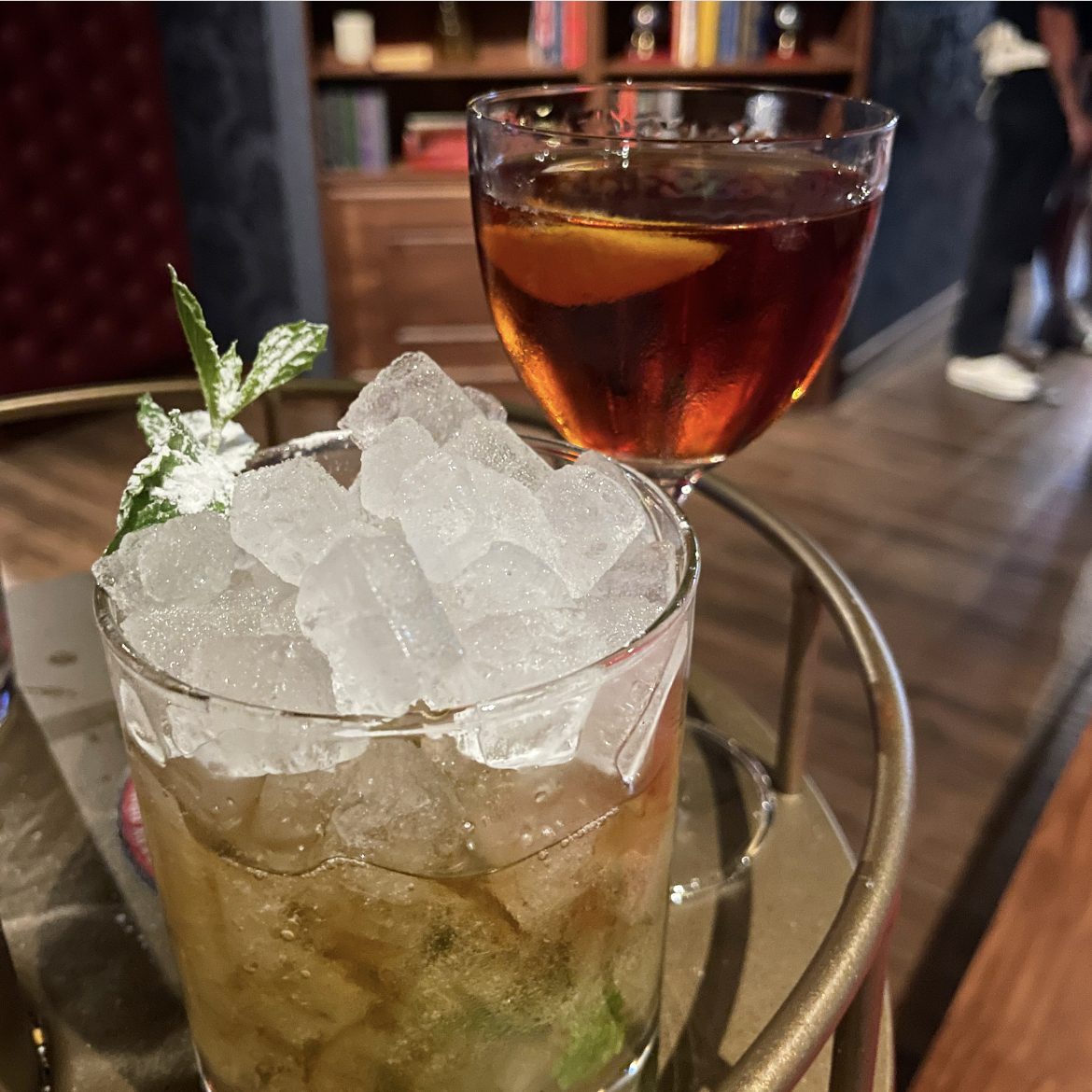 The Library Cocktails: Colossus of New York (Rye, Vermouth, Cynar, Bitters) & August Sunset (Vodka, Aperol, Lemon cordial)