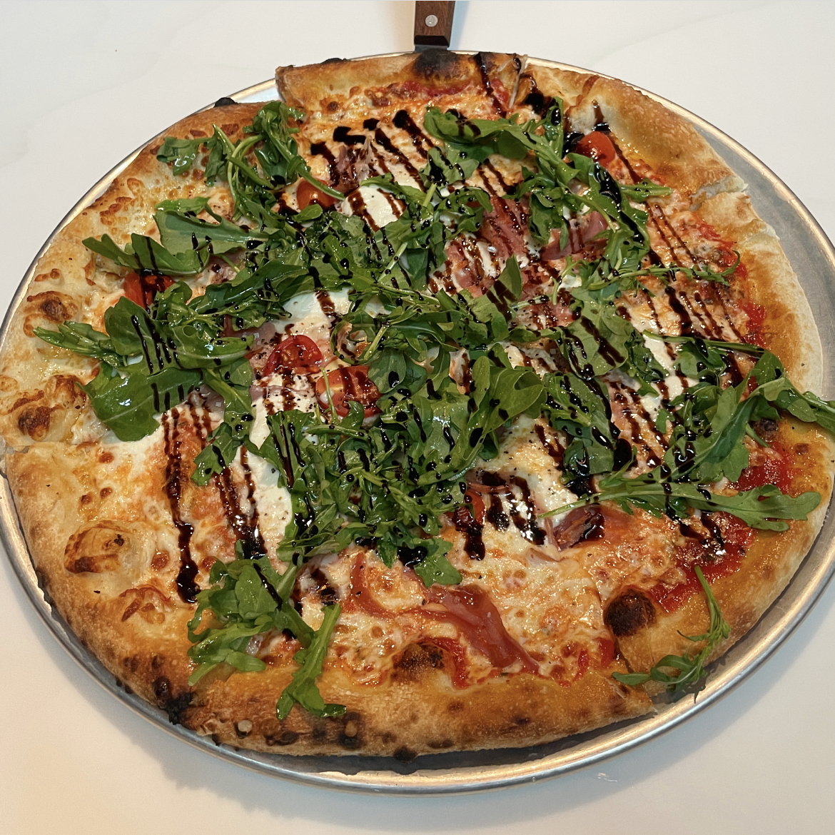 Burrata & Prosciutto Pizza: San Marzano tomatoes, mozzarella, burrata, prosciutto, heirloom grape tomatoes, arugula, garlic, EVOO & balsamic reduction