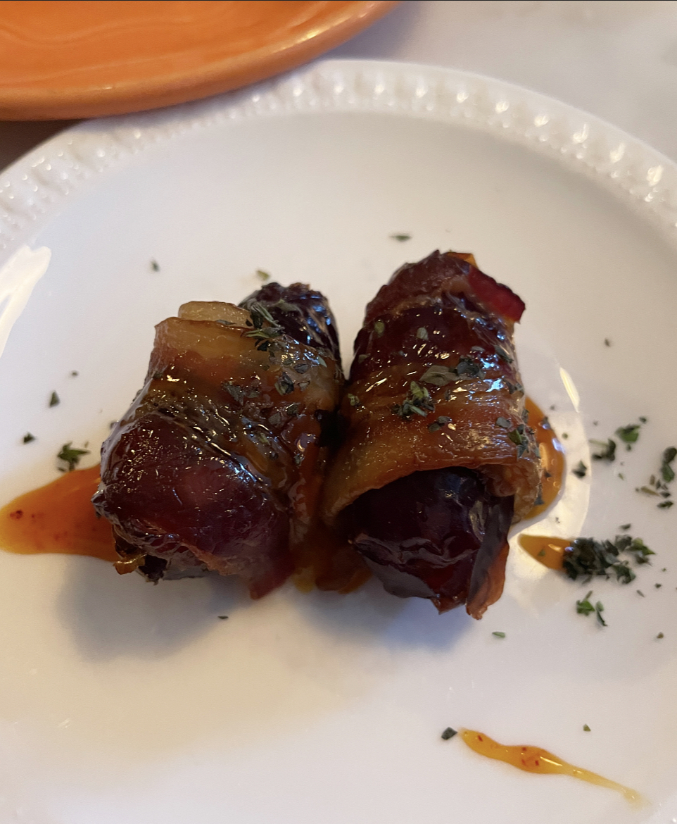 Bacon Wrapped Dates: Feta, truffle honey, oregano