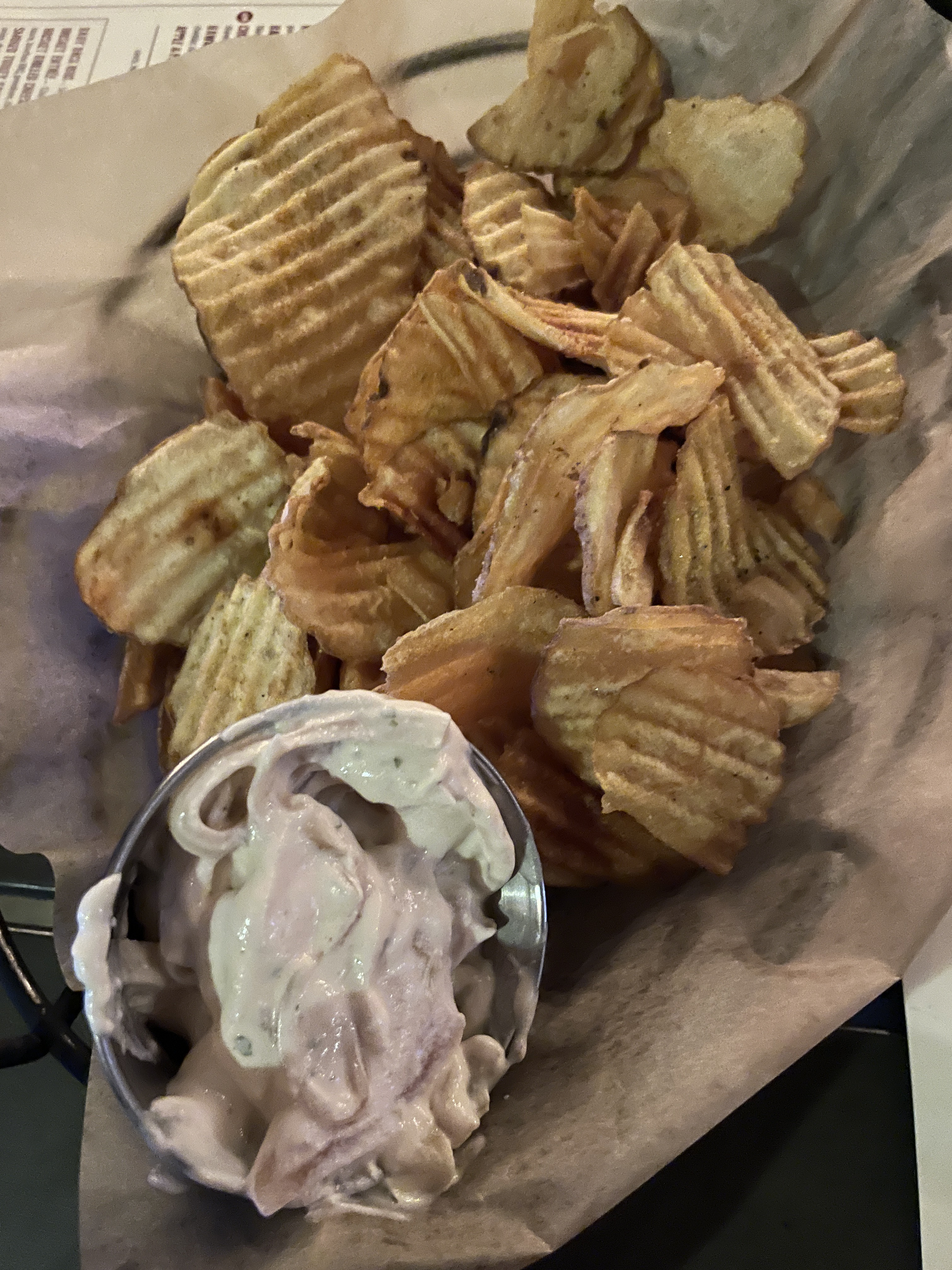 Cayenne Truffle Chips: House-fried and tossed in truffle salt served with caramelized onion dip