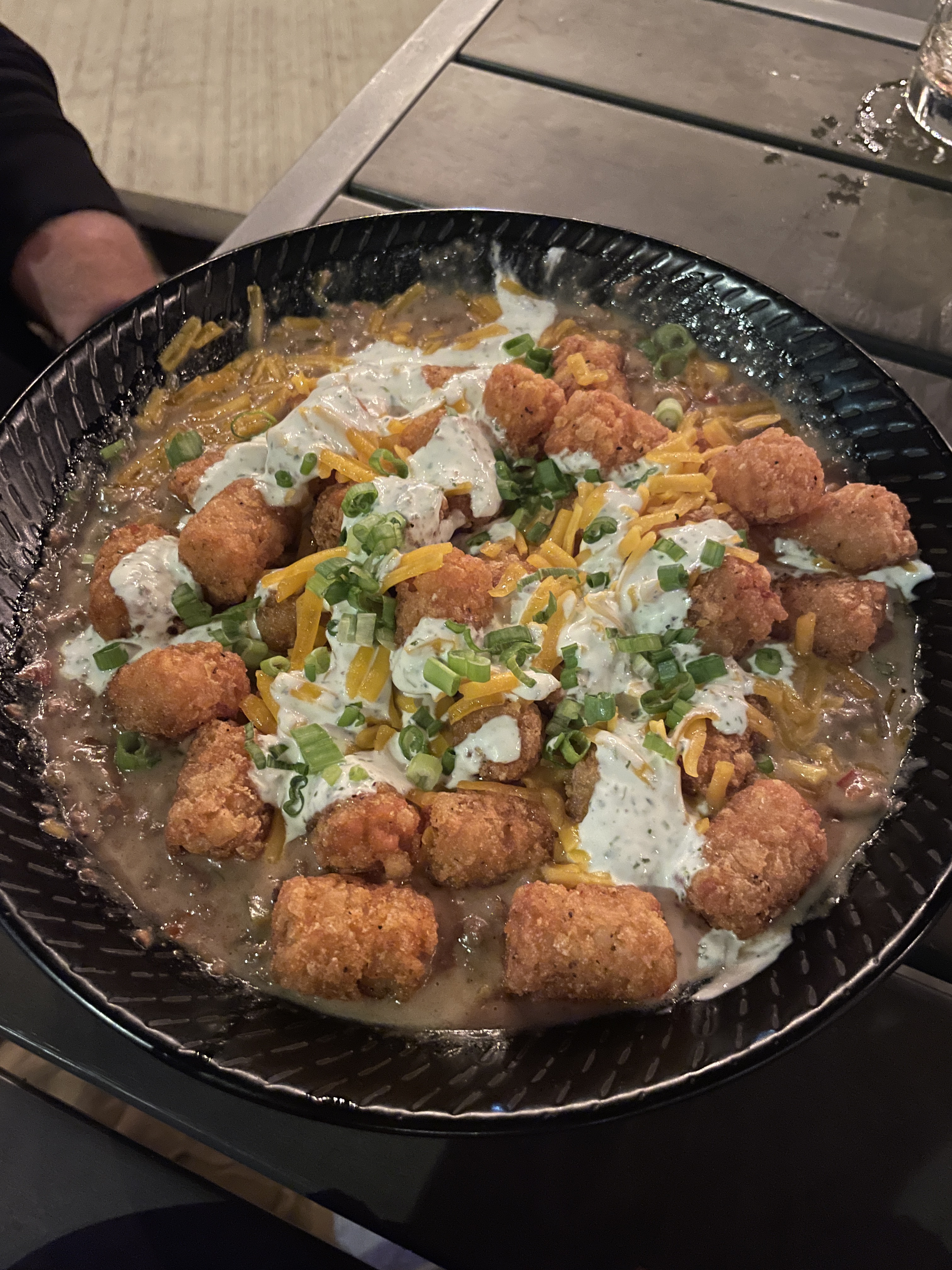 Tator Tot Hot Dish: Tater tots, mushroom gravy, corn, peppers, wagyu beef, cheddar cheese, cilantro sour cream