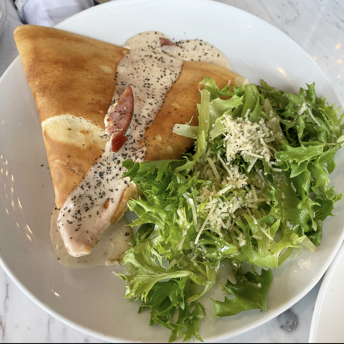 Ham & Gruyere Crepe: Smoked ham, gruyère, dijon mustard, fresh oregano, & béchamel sauce