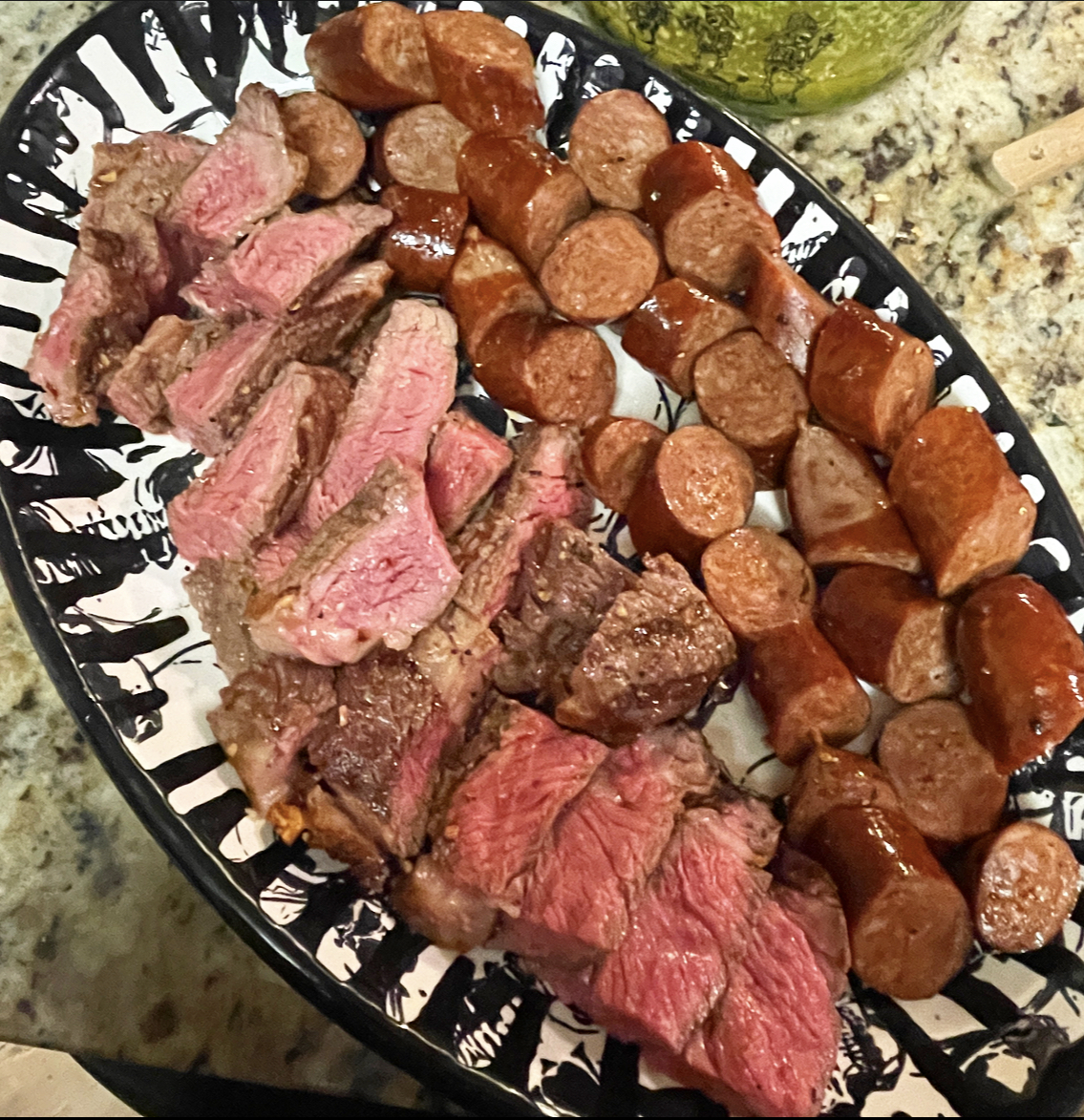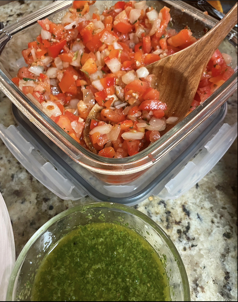 “We” ended up picking rib-eye and chorizo and served it with homemade chimichuri and salsa criolla (an Argentinian salsa).