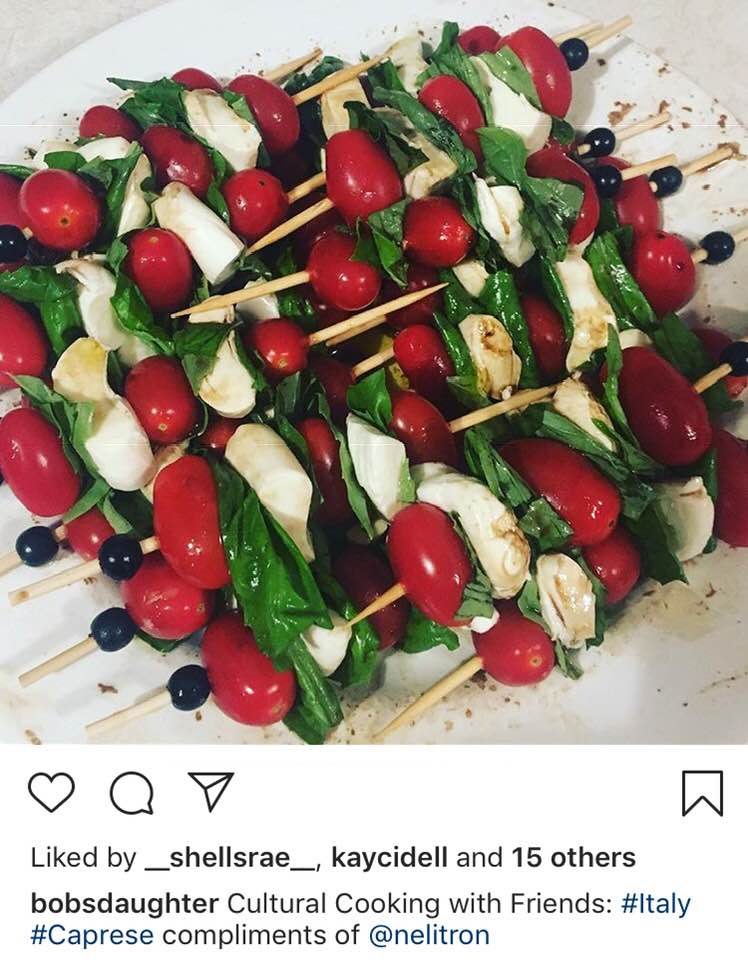 - Italy: Gnocchi and homemade pasta sauce, Caprese skewers, focaccia, Tiramasu (I very much cheated on this one and bought it haha)