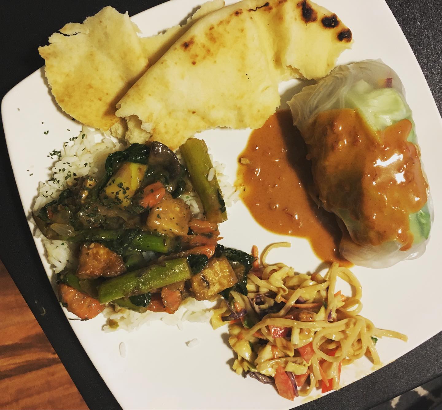 - Thailand: Coconut curry with air fryer tofu, spring rolls with peanut sauce, and noodle salad