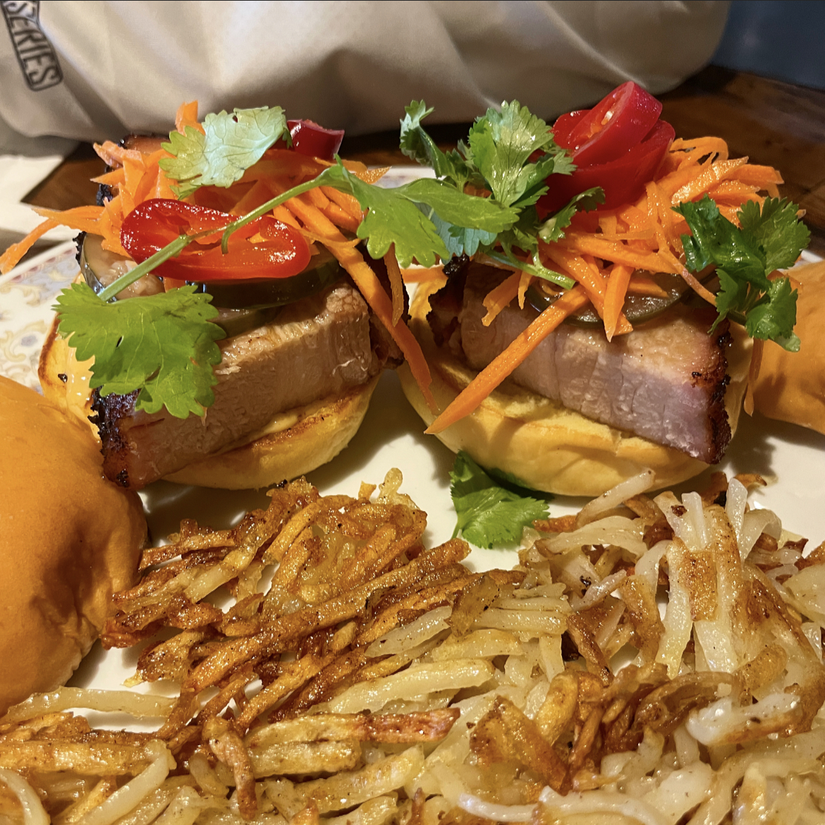 Pork Belly Breakfast Sliders: Crispy pork belly, two fried eggs, cucumber, pickled fresno, pickled carrot, cilantro, sriracha mayo