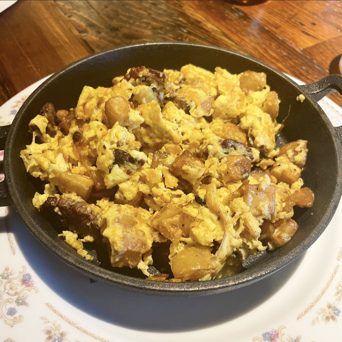 Meat Lovers Scramble: Bacon, pork belly, andouille sausage, pulled pork, crispy potato, topped with cheddar cheese and scallions