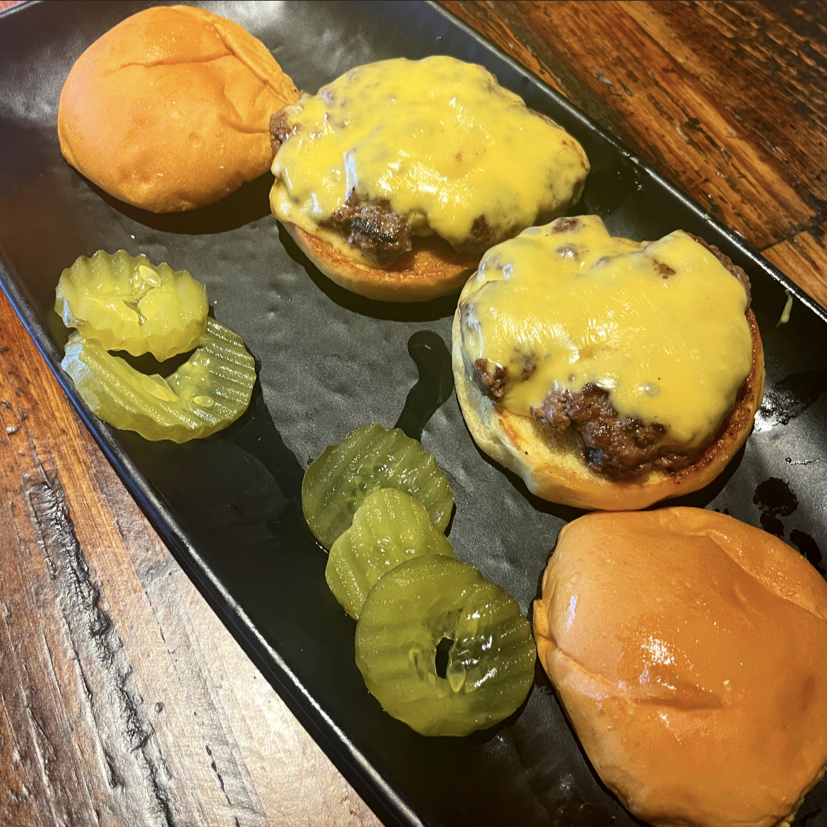 K&R Cheeseburger Sliders: 2 famous buttery sliders, secret seasoning, topped with government cheese, on brioche bun. Served with hamburger dills on the side