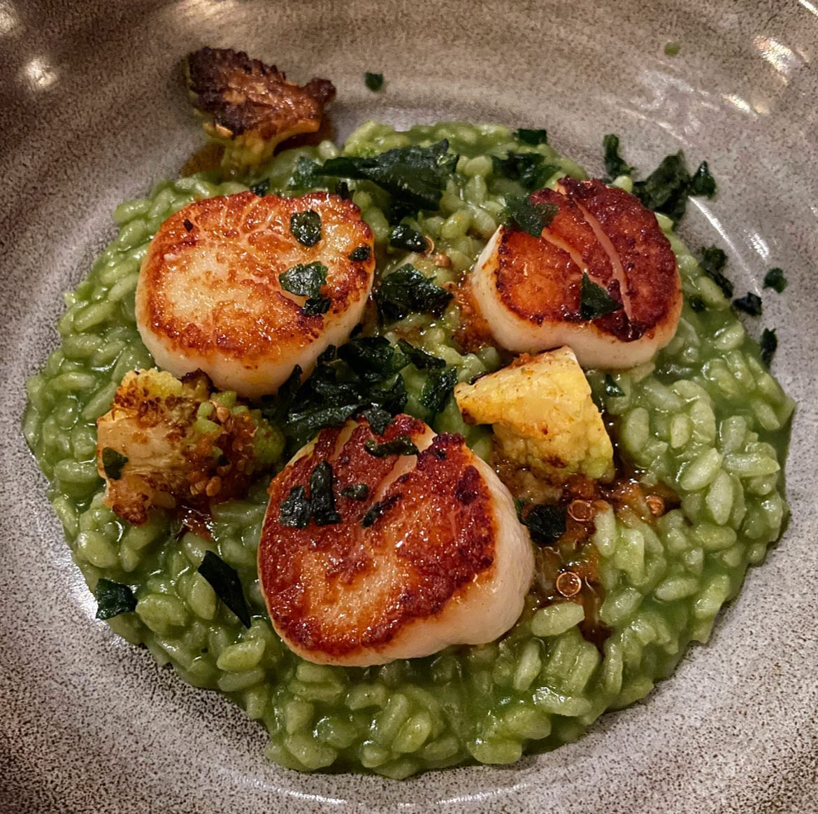 Scallops: Spinach risotto, sour orange, romanesco, espelette pepper