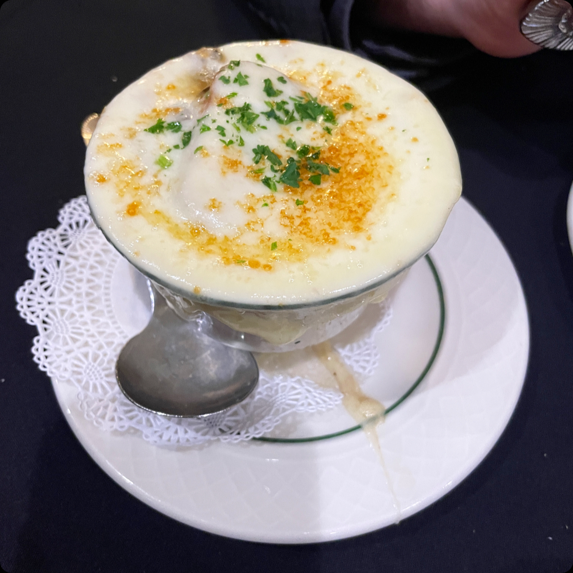 French Onion Soup: Broth and onions topped with croutons, melted swiss & provolone cheese