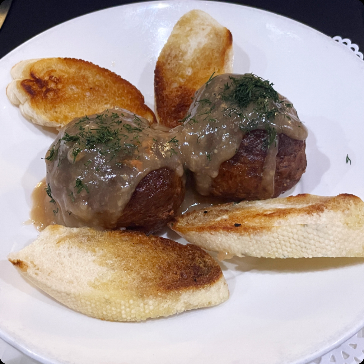 Swedish Hereford Meatballs: With demi glaze sour cream sauce topped with dill and served with crostini