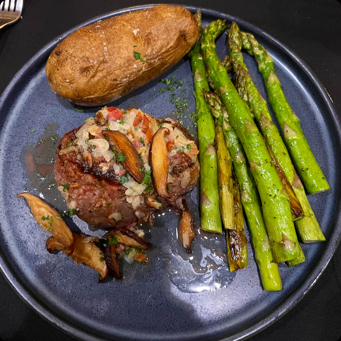10oz Manhattan Filet: Center cut striploin with melted crispy potato and bacon hotel butter and wild mushrooms. Served with baked potato and asparagus.
