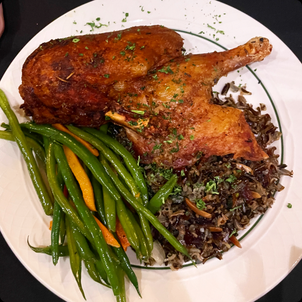 Roast Duckling: Roasted half duck, served with peppercorn sauce. Served with vegetable du jour and Minnesota wild rice.