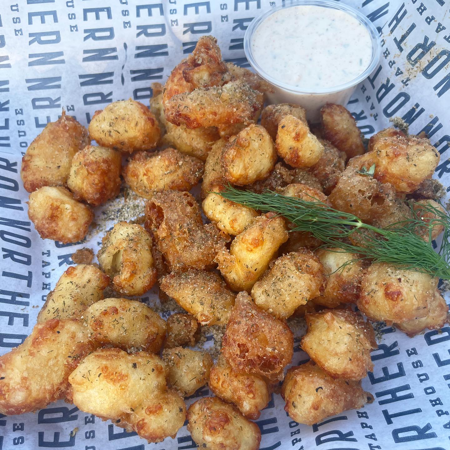 Dill Cheese Curd: Fried Ellsworth Dill Pickle Seasoned Curds, seasoned with dill pickle dry rub and served with creamy dill sauce