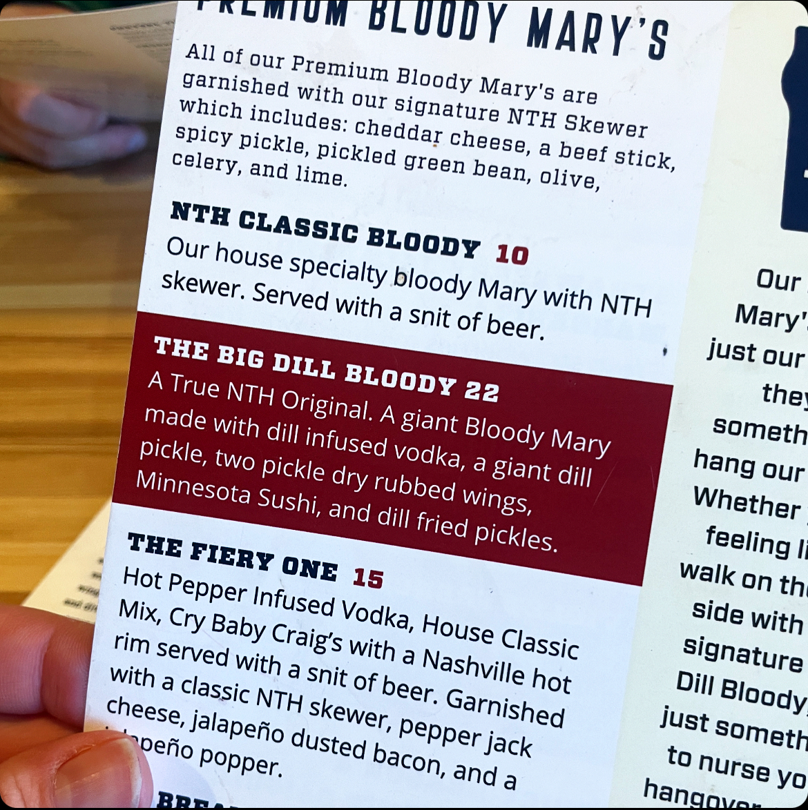The Big Dill Bloody Mary: Dill infused vodka, a giant pickle, two pickle dry rubbed wings, Minnesota sushi, and dill fried pickles