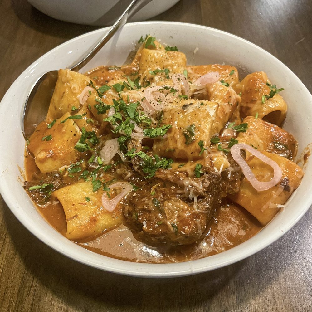 PACCHERI: Braised short ribs – gorgonzola rosemary – caciocavello – pickled shallots
