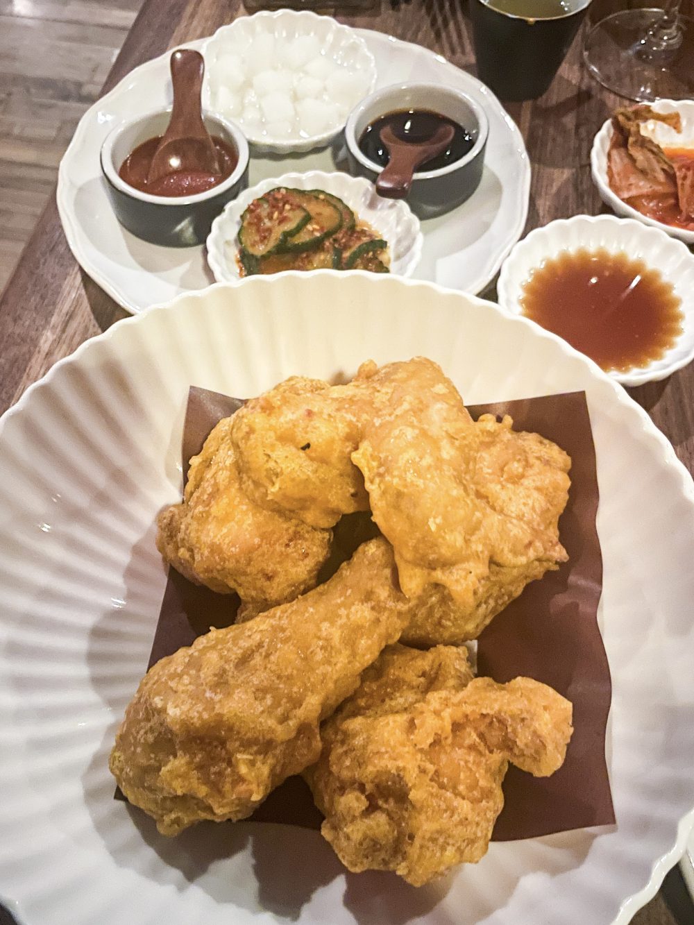 KOREAN FRIED CHICKEN: PICKLED DAIKON, CUCUMBER MUCHIM, SWEET CHILI AND GARLIC SOY
