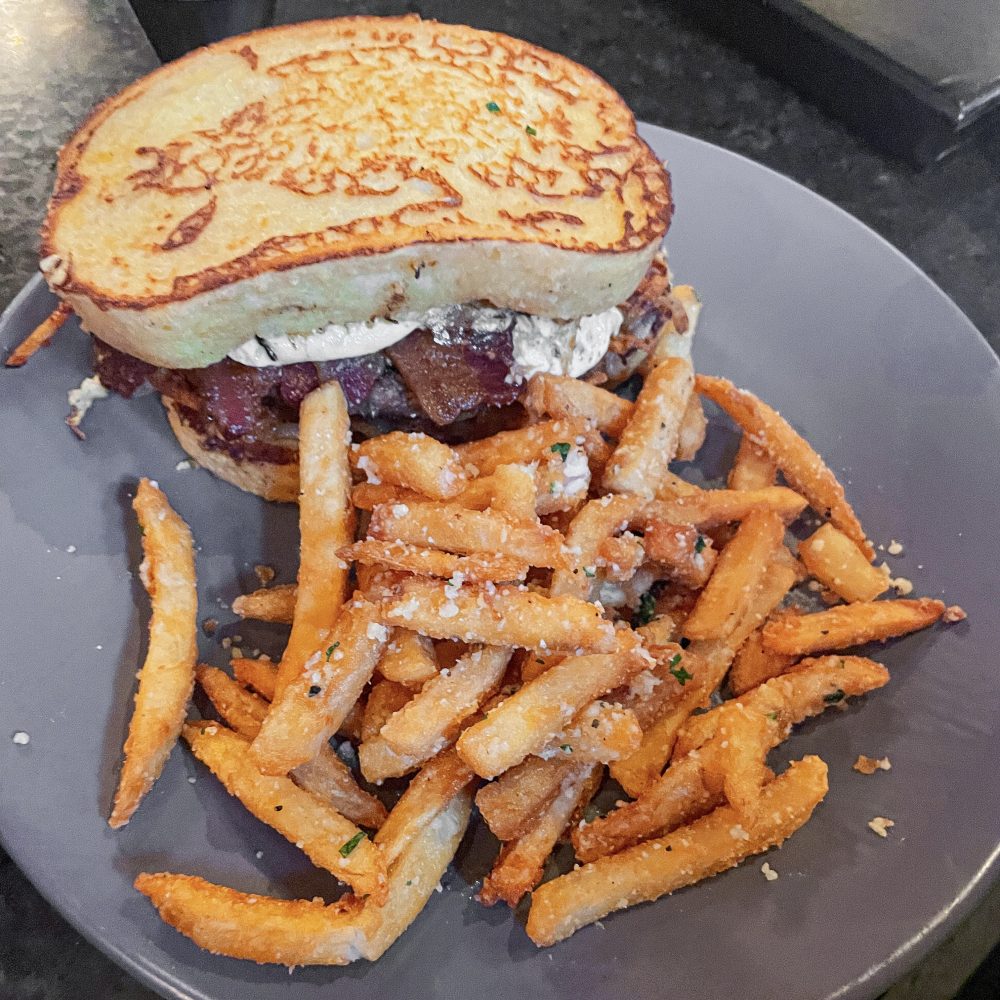 Husband had the Next Day Burger with overeasy egg. He was surprised to see toast vs a bun, but he said it was still good, just more of a patty melt style. He also (at my insistence) upgraded to the parmesan garlic fries so I could have some – they were delicious.