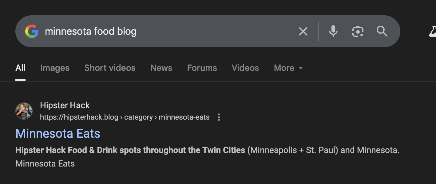 Not only do I rank #1 for terms like “Minnesota Food Blog” and “Minnesota Food Reviewers,” my reviews of Twin Cities restaurants consistently rank on the first page also.